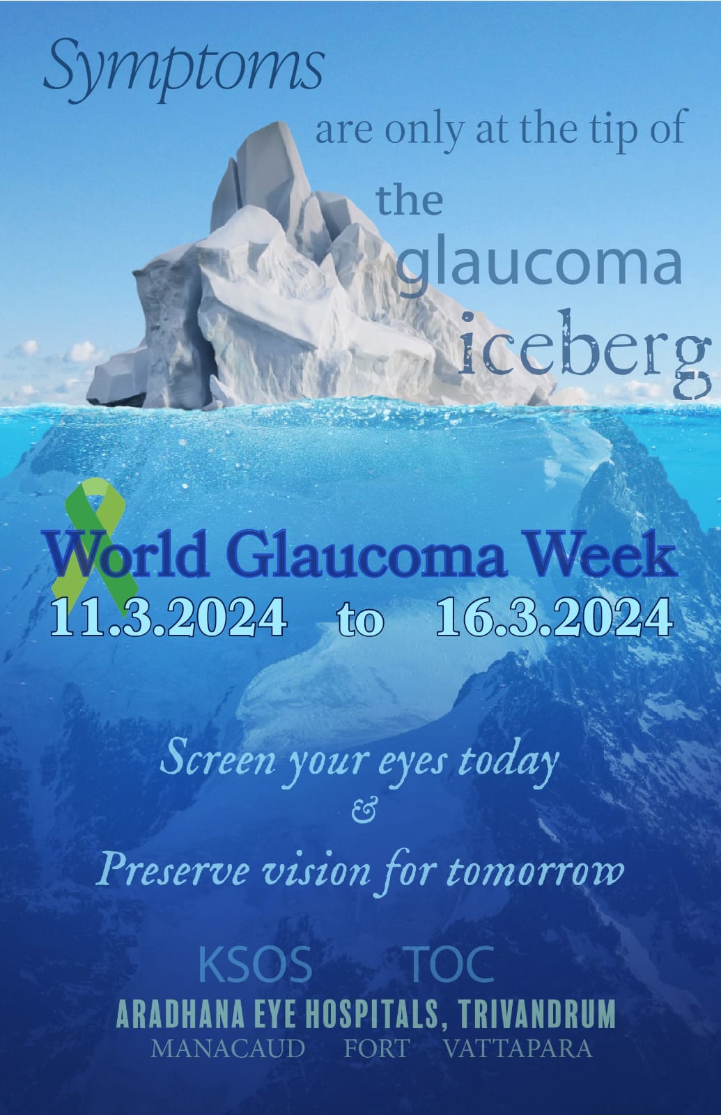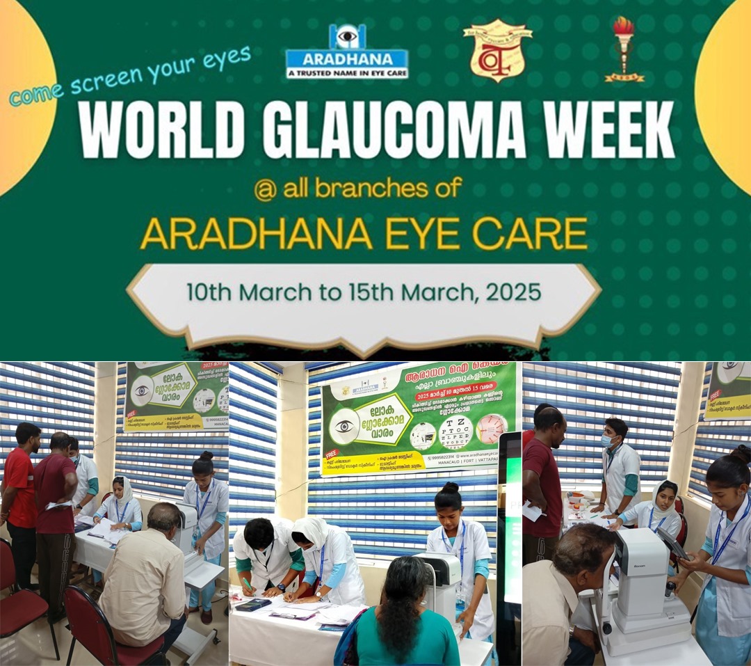This year, for World Glaucoma Week, 10.3.2025 to 15.3.2025, all branches of Aradhana Eye Hospitals welcomed the public of Trivandrum district to get their eyes screened for glaucoma. Glaucoma is the leading cause of irreversible blindness in India. This screening programme was designed to not only examine the patients but also to educate them and their by-standers regarding the disease. A week of activities came to a close on Saturday 15.3.2025. A variety of screening and educational tools were used- live props made specially by our students, state of the art equipment such as OCT Spectralis , Clarus 500 and HFA for evaluation , and expert specialist opinion for every patient who came for the glaucoma camp, all free of cost. In the coming years, we hope that even more patients would avail this great opportunity to screen their eyes on a yearly basis.